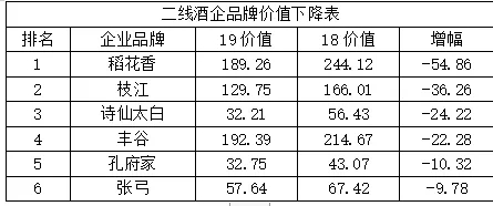 三、部分地方二線酒企品牌價(jià)值下降明顯