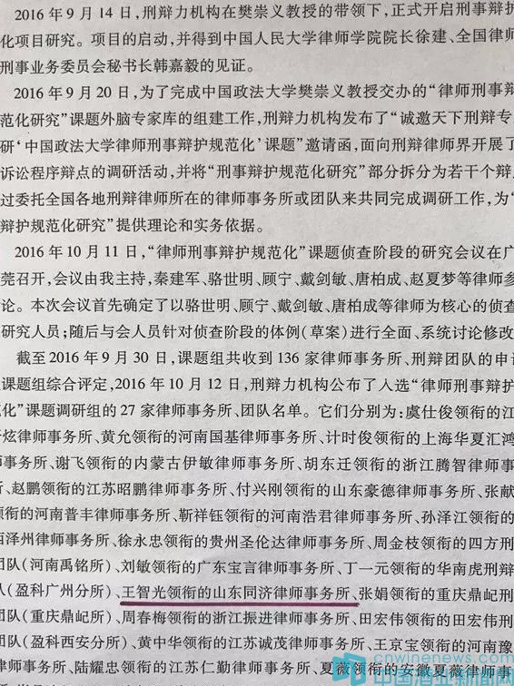 2016年9月14日,中國政法大學對“刑事辯護規范化”研究課題正式立項,主要研究工作由劉平凡帶領的課題組承擔,面向全國刑辯律師界發布了“誠邀天下刑辯專家,共研律師刑事辯護規范化課題”《邀請函》,開展了刑事訴訟程序辯點的調研活動,《邀請函》發出后,課題組共收到136家律師事務所、刑辯團隊的申請,經綜合評定,入選了27家律師事務所、團隊,匯集了全國各地超過300名刑辯律師,分批在廣州市進行了封閉式拓展訓練,對其中的重點問題進行實證調研分析。山東同濟律師事務所刑委會主任王智光律師領銜的調研組參與了“刑事偵查階段”的調研。