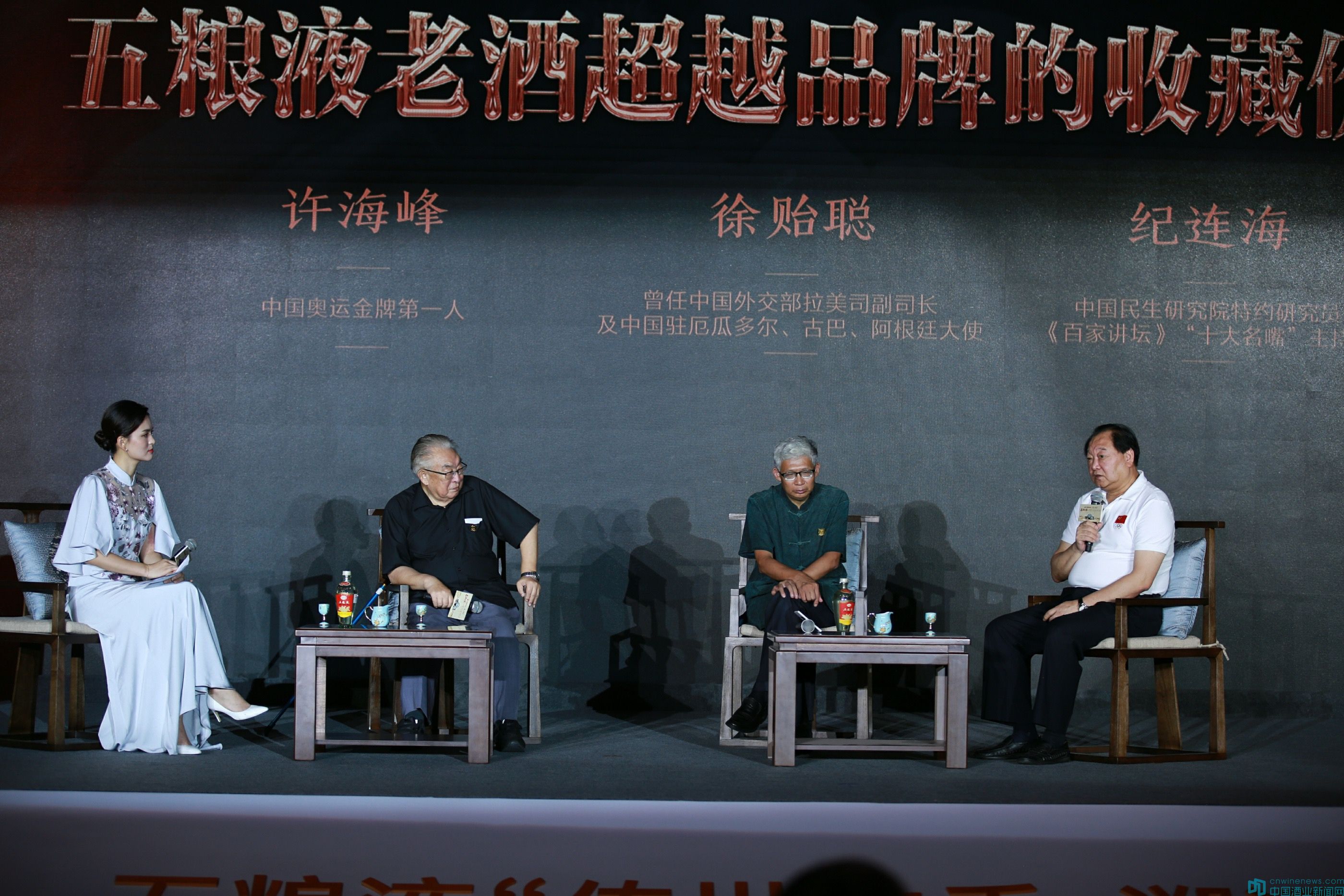 活動現場,宋書玉緊緊圍繞五糧液老酒價值,從行業到企業兩個維度發表主旨演講。同為老酒忠實收藏愛好者的紀連海,以老酒與中國文化的傳承與表達為核心,圍繞老酒與中華文化發表演講,并與徐貽聰、許海峰展開對話,分別從歷史文化、外交和體育精神等不同角度,解讀五糧液老酒背后的動人故事、工匠精神,共同探討了陳年老酒的收藏價值、文化價值。