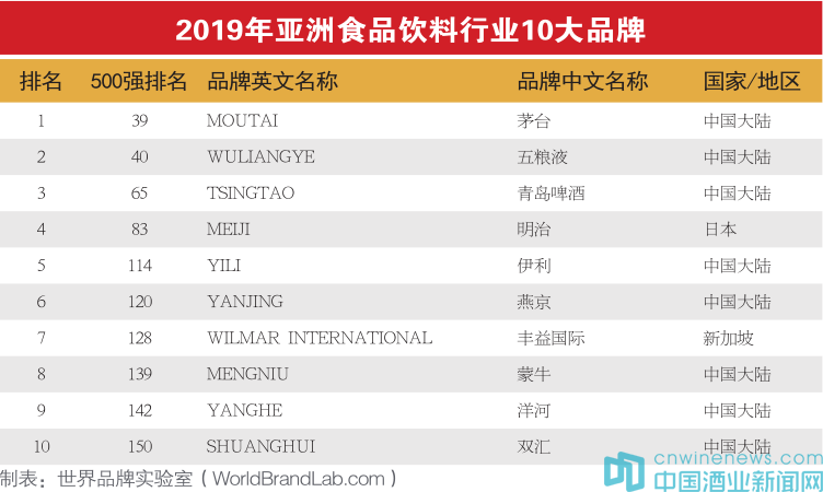 2019年,《亞洲品牌500強(qiáng)》共有來(lái)自22個(gè)國(guó)家和地區(qū),金融、傳媒、食品飲料、信息技術(shù)、零售、汽車和石油化工等40個(gè)相關(guān)行業(yè)的品牌入選。其中,食品飲料行業(yè)共有43個(gè)品牌入選,茅臺(tái)、五糧液、青島啤酒位列前三名。