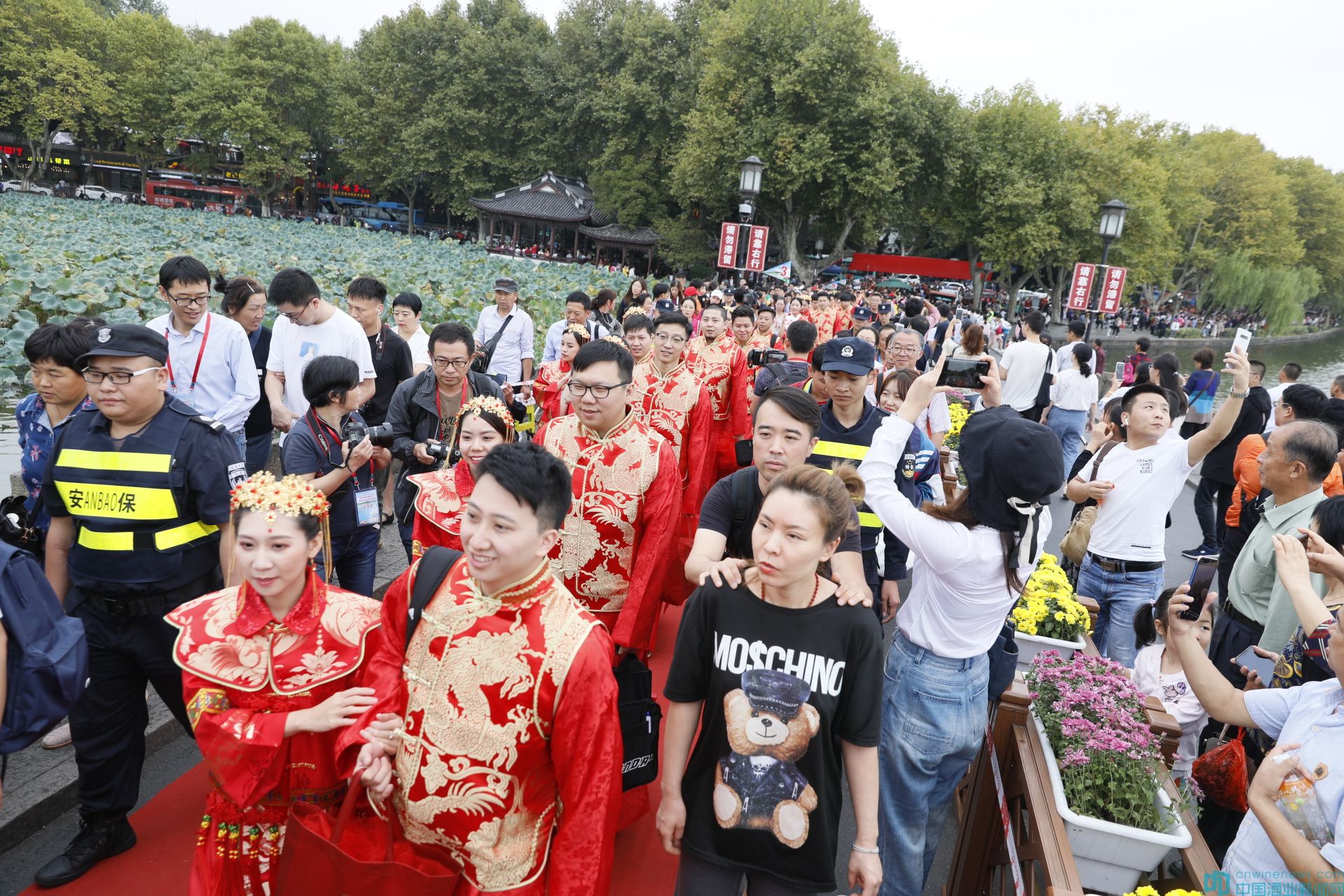 西湖十景之一的“柳浪聞鶯”早已是一派喜慶歡騰的景象。在主婚場,在司儀的主持下,新人們行三拜大禮、挑開紅蓋頭、互贈信物、相互擁吻,以中式傳統(tǒng)婚禮的儀式締結(jié)百年好合之約。
