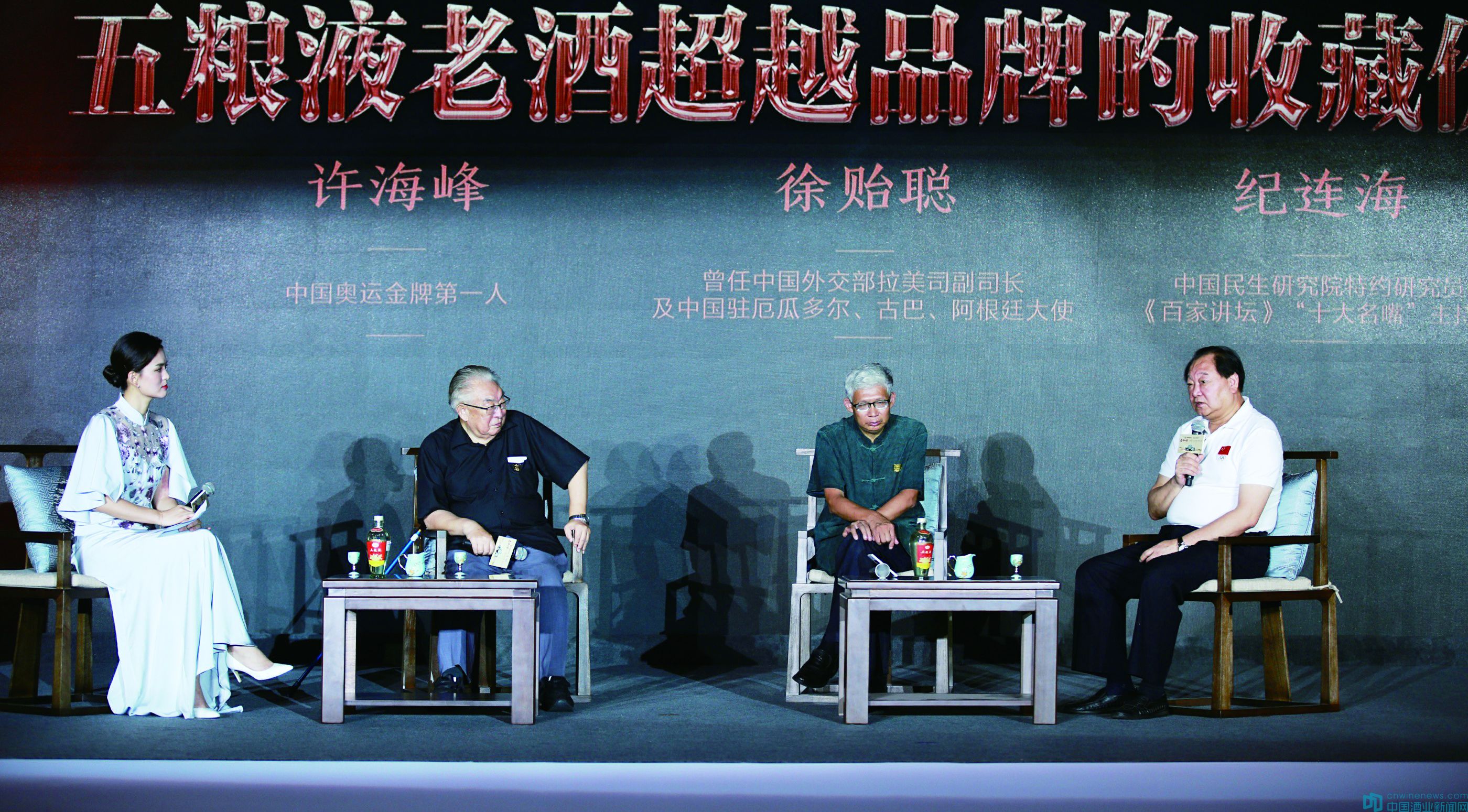 8月16日,“老酒回家”暨“五糧液傳世濃香·溯源之旅”活動(dòng)在五糧液公司舉辦。圖為中國(guó)駐厄瓜多爾、古巴、阿根廷前大使徐貽聰(左二),中國(guó)奧運(yùn)金牌第一人、健康中國(guó)推進(jìn)委員會(huì)委員許海峰(右一),中國(guó)民生研究院特約研究員、《百家講壇》著名主講人紀(jì)連海(右二)出席活動(dòng)。