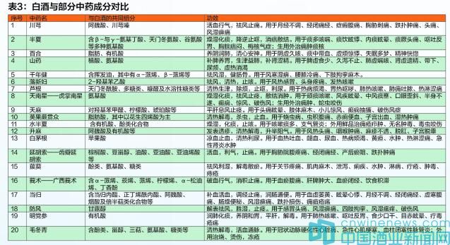 表3為白酒與部分中藥成分對比