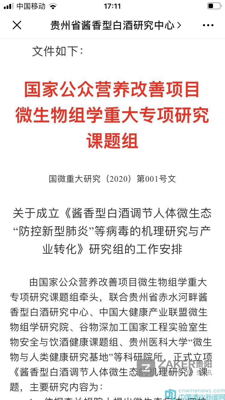 2 月 18 日,貴州省醬香型白酒研究中心微信號發布:【硬核發布】關于成立《醬香型白酒調節人體微生態 " 防控新型肺炎 " 等病毒的機理研究與產業轉化》等研究組的工作安排。