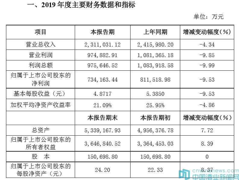 2月28日晚間,洋河股份發布2019年度業績快報,全年實現營業總收入 2,311,031.12 萬元,同比下降 4.34%;實現歸屬于上市公司股東的凈利潤 734,163.44 萬元,同比下降 9.53%。