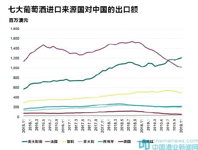 剛剛過去的2019年,澳大利亞葡萄酒對中國市場出口額增長13%,創下 12.8 億澳元新高,鞏固了其作為中國第一大葡萄酒進口來源國的地位。持續數月的森林大火災使該國釀酒葡萄產量損失達60,000噸,占全國產量的4%。澳大利亞生產商估計,由于新冠疫情的影響,1月和2月間對中國的銷量下降了90%。