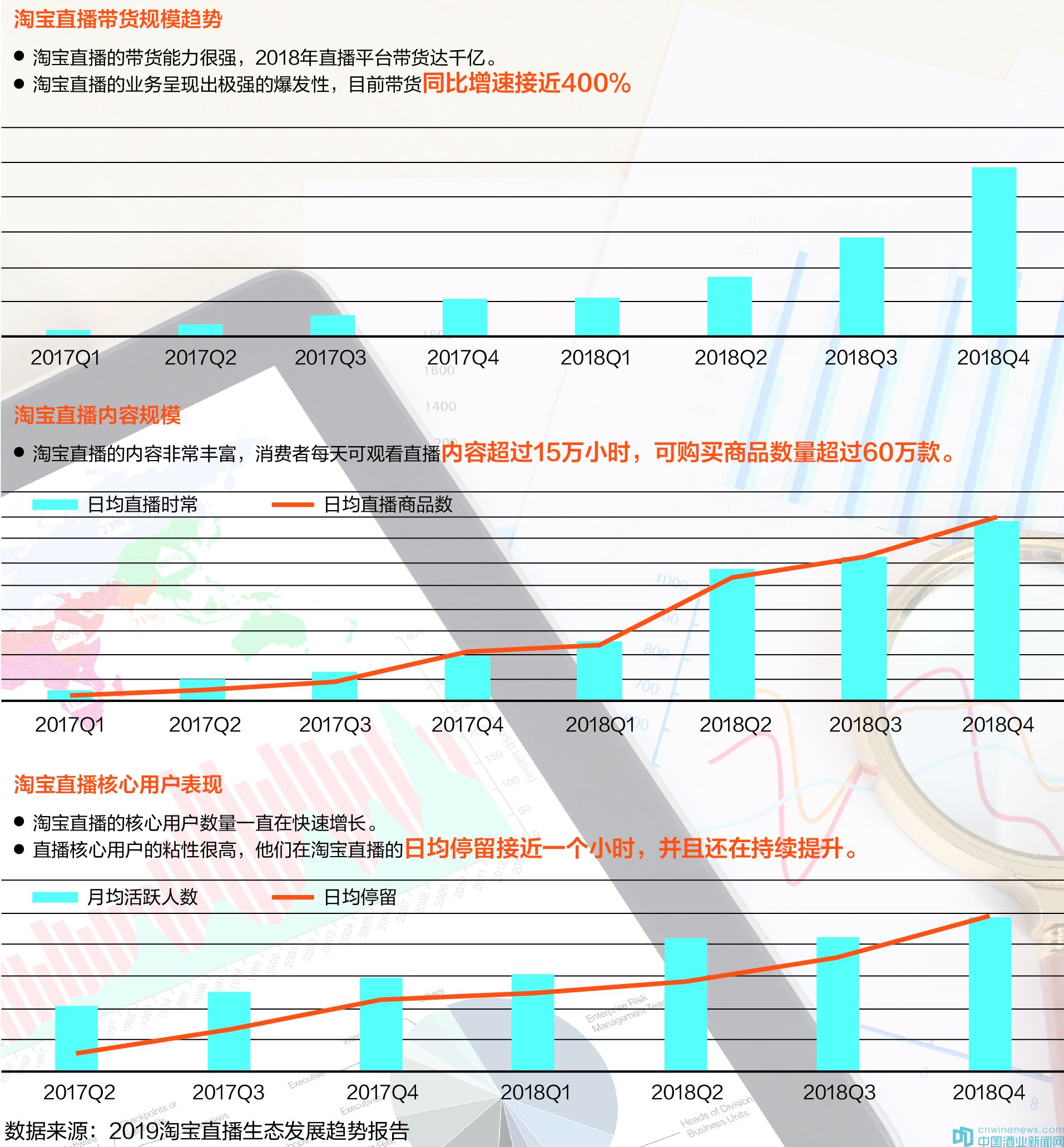 數據顯示,淘寶直播日均直播場次超6萬場,直播時長超過15萬小時,相當于3萬3千多場春晚。2018年淘寶直播平臺帶貨超千億,帶貨同比增速接近400%,可購買商品數量超過60萬款。