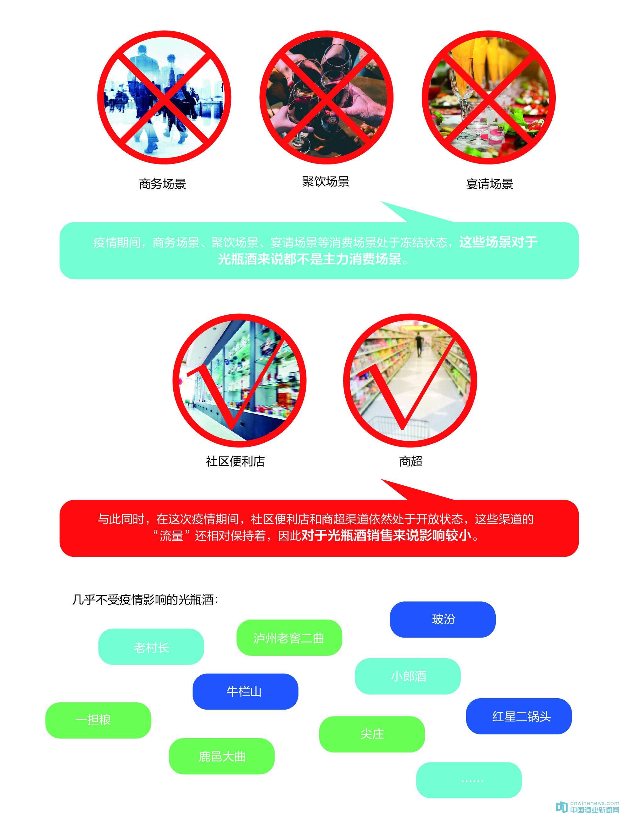 北京卓鵬戰略咨詢董事長田卓鵬表示,疫情期間,商務場景、聚飲場景、宴請場景等消費場景處于凍結狀態,這些場景對于光瓶酒來說都不是主力消費場景。與此同時,在這次疫情期間,社區便利店和商超渠道依然處于開放狀態,這些渠道的“流量”還相對保持著,因此對于光瓶酒銷售來說影響較小。