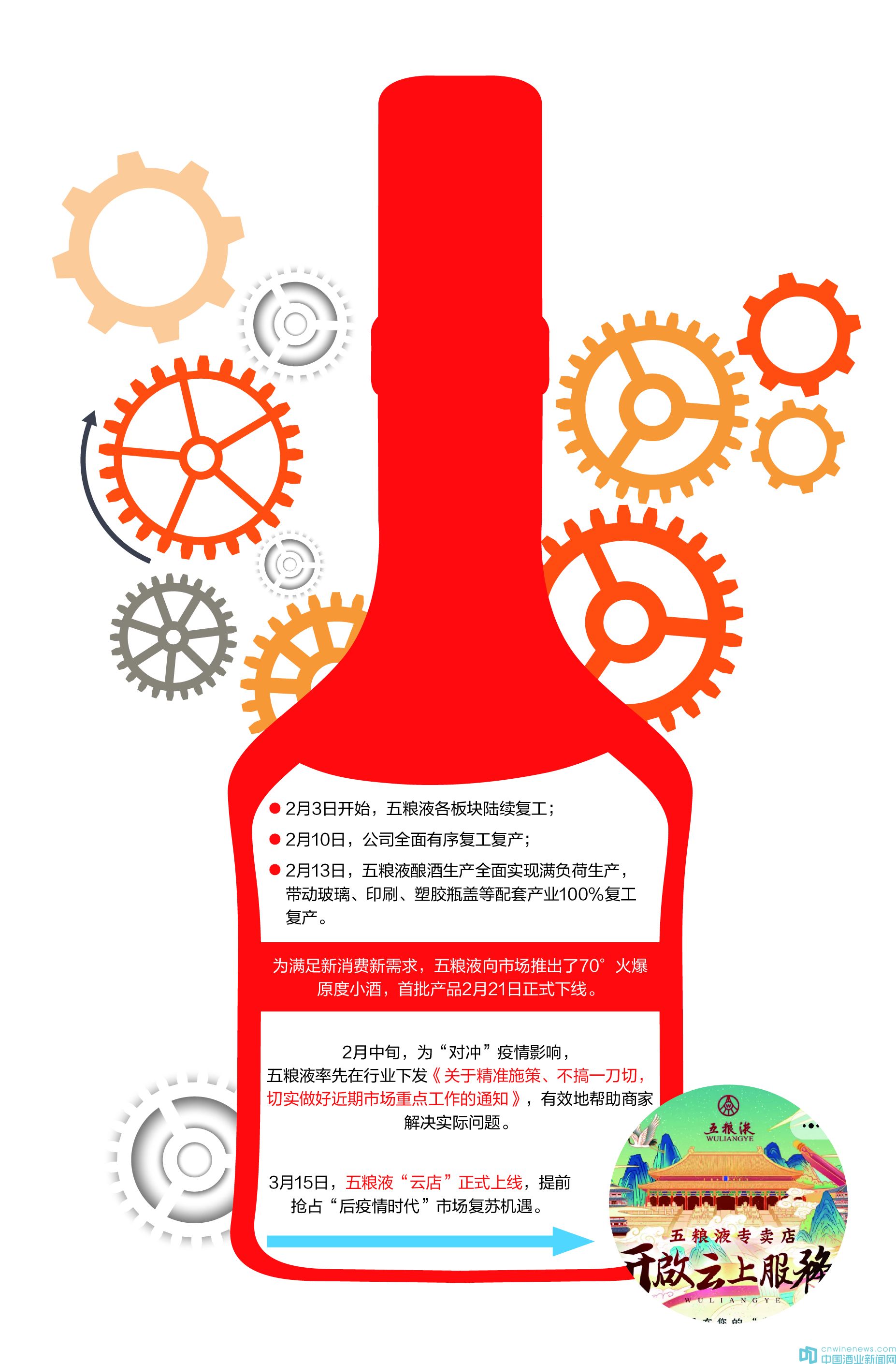 2月3日開始,五糧液各板塊陸續復工;2月10日,公司全面有序復工復產;2月13日,五糧液釀酒生產全面實現滿負荷生產,帶動玻璃、印刷、塑膠瓶蓋等配套產業100%復工復產。
