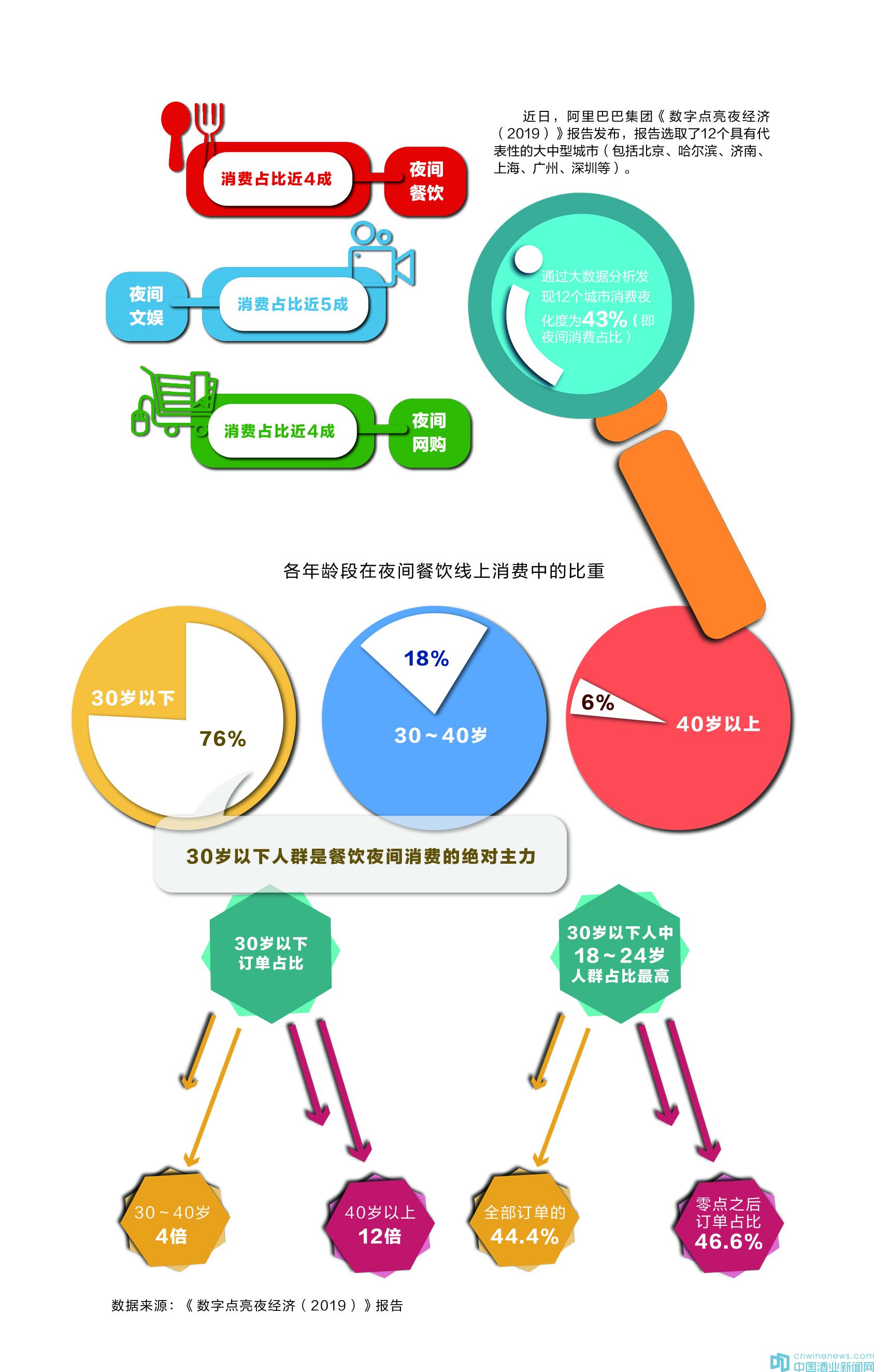 近日,阿里巴巴集團(tuán)《數(shù)字點(diǎn)亮夜經(jīng)濟(jì)(2019)》報(bào)告發(fā)布,報(bào)告選取了12個(gè)具有代表性的大中型城市(包括北京、哈爾濱、濟(jì)南、上海、廣州、深圳等),通過大數(shù)據(jù)分析發(fā)現(xiàn),12個(gè)城市消費(fèi)夜化度為43%(即夜間消費(fèi)占比),其中,夜間餐飲消費(fèi)占比近4成,夜間文娛消費(fèi)占比近5成,夜間網(wǎng)購消費(fèi)占比超4成。