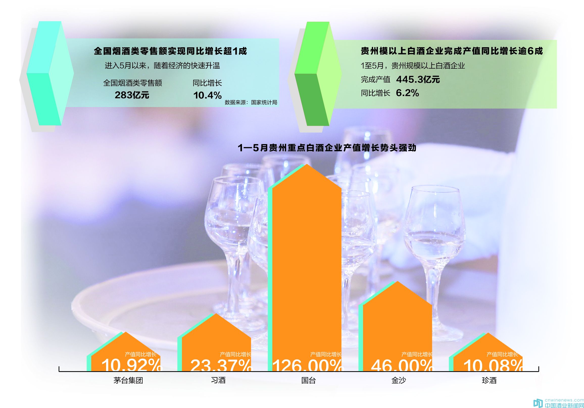 在后疫情時代,醬香型白酒增速同樣喜人。今年第一季度,茅臺營業收入和歸屬于上市公司股東的凈利潤,同比增幅分別為12.76%和16.69%。貴州省優質煙酒產業工作專班消息稱,1至5月,貴州省規模以上優質煙酒產業完成產值661.6億元,同比增長7.8%,高于全省工業增加值增速7.6個百分點,為實現“雙過半”奠定了堅實基礎。其中,白酒產業方面:1至5月,規模以上白酒企業完成產值445.3億元,同比增長6.2%。重點企業增長勢頭較好。1至5月,茅臺集團產值同比增長10.92%;習酒產值同比增長23.37%;國臺、金沙、珍酒產值分別增長126%、46%、10.08%。
