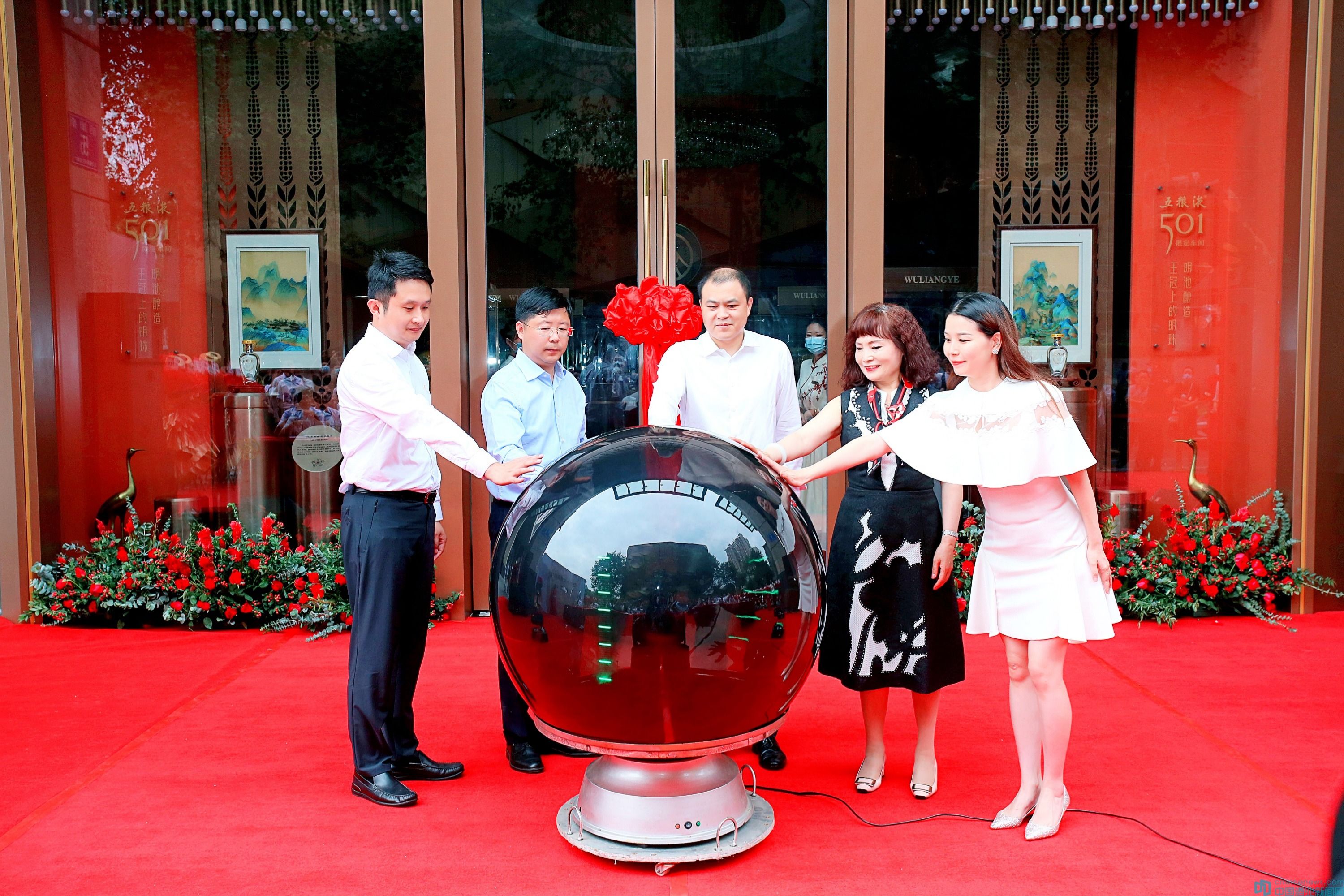 在現場嘉賓的見證下,馬德鴻、王金蓉、張宇及五糧液股份公司專賣店管理部部長卓平、成都鴻博酒業有限公司總經理莊鎵共同點亮啟動球,展廳燈光徐徐亮起,標志著全國首家“五糧液文化體驗店”正式開業,與天府廣場周邊諸多文化“金字招牌”一道,向來往游客講述最經典的四川故事、四川白酒故事。