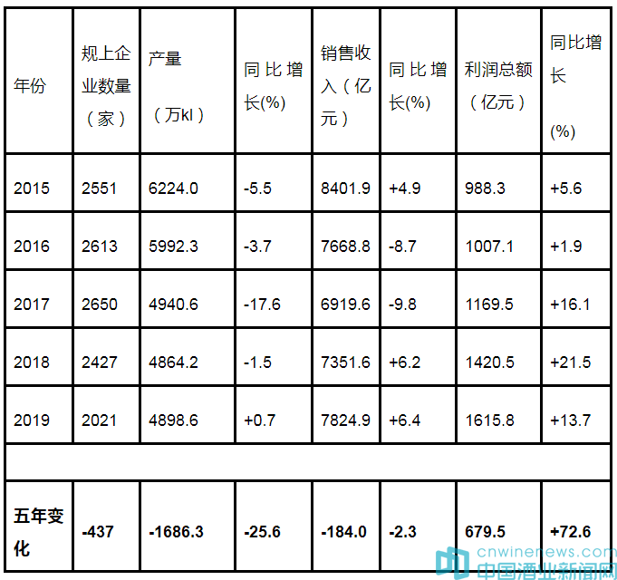 通過對比2015年~2019年酒類產業的各項經濟指標數據,這五年來,呈現出以下變化: