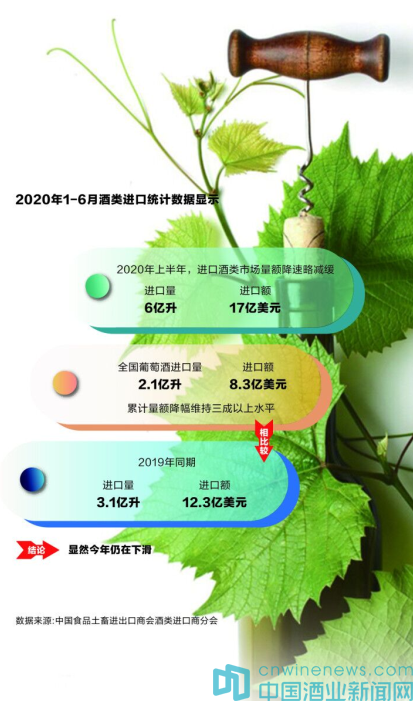 中國食品土畜進出口商會酒類進口商分會發布的2020年1~6月酒類進口統計數據顯示:今年上半年,進口酒類市場量額降速略減緩:進口量6億升,進口額17億美元。其中,全國葡萄酒進口量2.1億升,進口額8.3億美元,累計量額降幅維持三成以上水平。