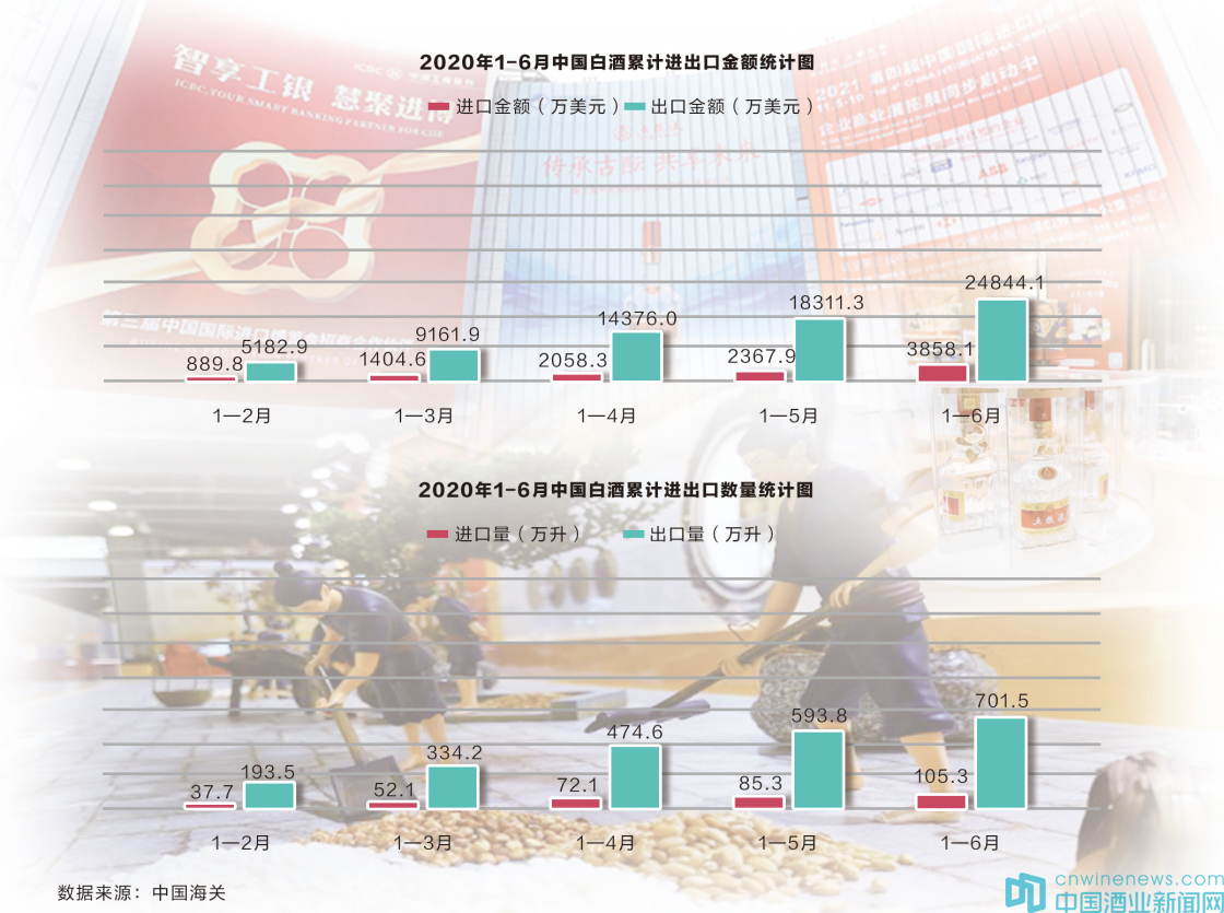 而根據中國海關數據顯示,同一時期,中國白酒的出口數量為701.5萬升,同比下降16.2%;出口金額為2.48億美元,同比下降18.9%。但值得關注的是,每個月的出口額與出口數量都在增長。