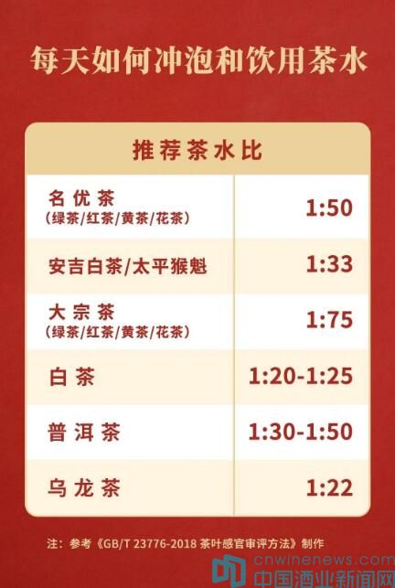 答:科學的茶葉沖泡技術要注重茶水比例、泡茶水溫、沖泡時間等。茶水比例方面,茶多水少則味濃,茶少水多則味淡,可根據個人口味進行調整。此外,茶類不同,用量也各有不同,可參考下圖中的比例進行沖泡: