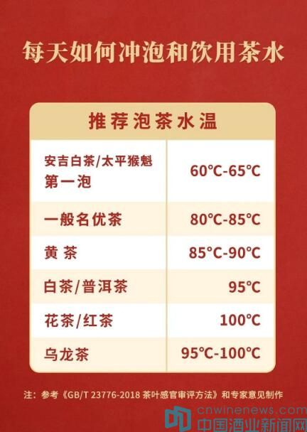 泡茶水溫方面,水溫過高,茶芽會被悶熟,泡出的茶湯黃濁,滋味較苦,維生素也易被大量破壞;水溫過低,茶葉中的有效物質未能充分溶出,使茶湯香薄味淡,甚至造成茶浮于水面沉不下去,飲用不便。可參考下圖中不同茶類的適宜水溫進行沖泡: