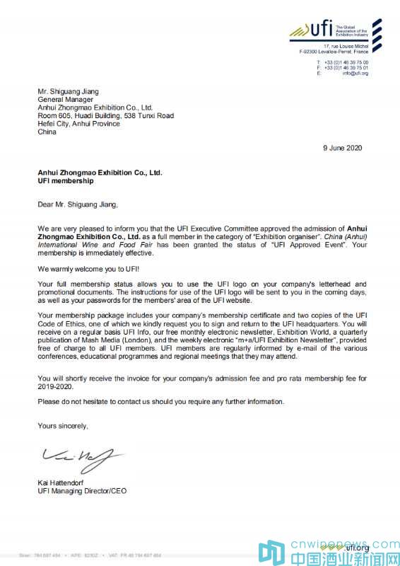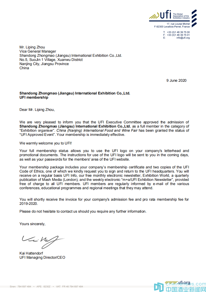 2020年6月9日,UFI(全球展覽業(yè)協(xié)會)巴黎總部傳來喜訊:中法合資高博中貿(mào)會展在山東、江蘇、安徽主辦的CNFE全國食品博覽會(濟南)、CNWFF中國(南京)國際糖酒食品交易會、CAWFF中國(安徽)國際糖酒食品交易會三展同時通過UFI(全球展覽業(yè)協(xié)會)認證,同時高博中貿(mào)會展在山東、江蘇、安徽三個子公司也通過UFI評審委員會的表決,分別正式成為UFI(全球展覽業(yè)協(xié)會)會員單位。通過UFI認證,是國際會展行業(yè)對主、承辦單位組織辦展能力的肯定,對展會在國際化、專業(yè)化、品牌化運營方面的充分認可。借助UFI認證展會的權(quán)威和影響,努力提升展會平臺新高度,助推會展經(jīng)濟的快速發(fā)展。