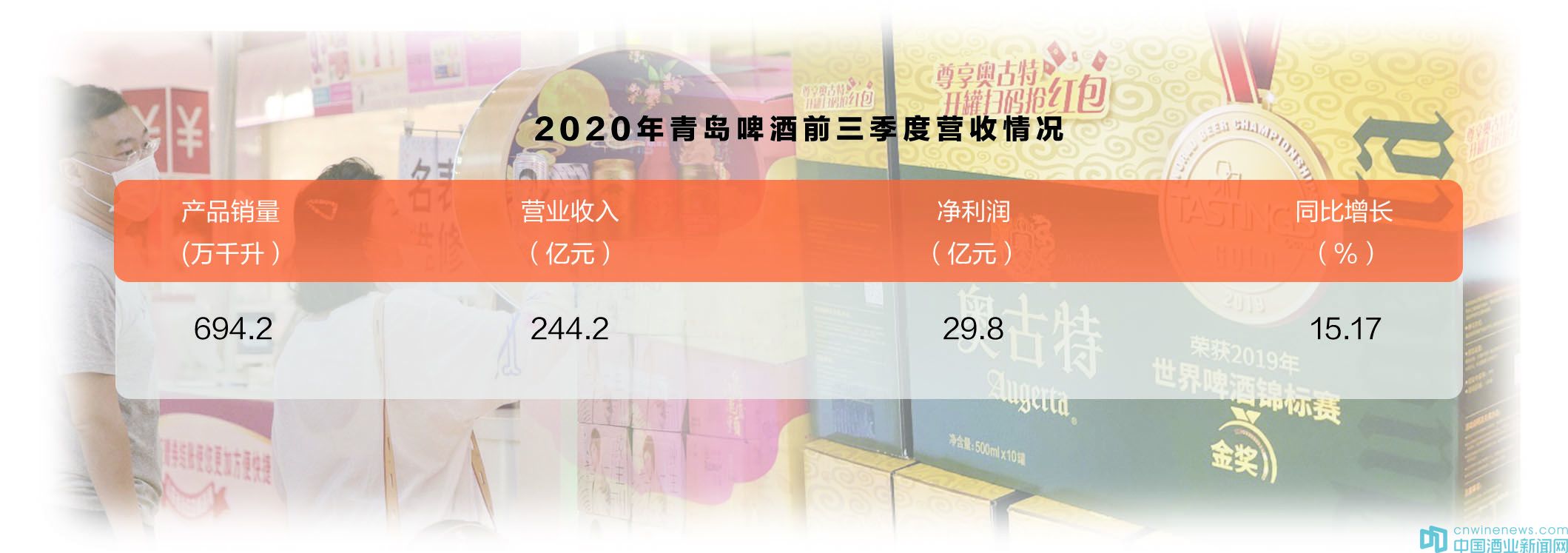 2020年前三季度,青島啤酒累計(jì)實(shí)現(xiàn)產(chǎn)品銷量694.2萬千升,實(shí)現(xiàn)營(yíng)業(yè)收入244.2億元;實(shí)現(xiàn)歸屬于上市公司股東的凈利潤(rùn)29.8億元,同比增長(zhǎng)15.17%。