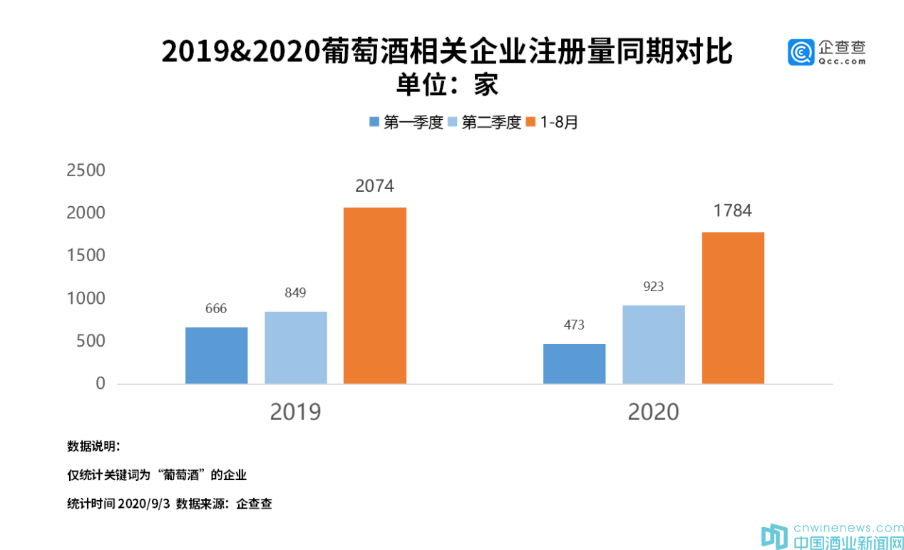 企查查數據顯示,今年上半年,我國葡萄酒相關的企業共注冊了1396家,同比下降7.9%。其中一季度注冊量為473家,二季度注冊量增長到923家。今年1-8月,我國葡萄酒相關企業的注冊量是1784家,同比下降14%。