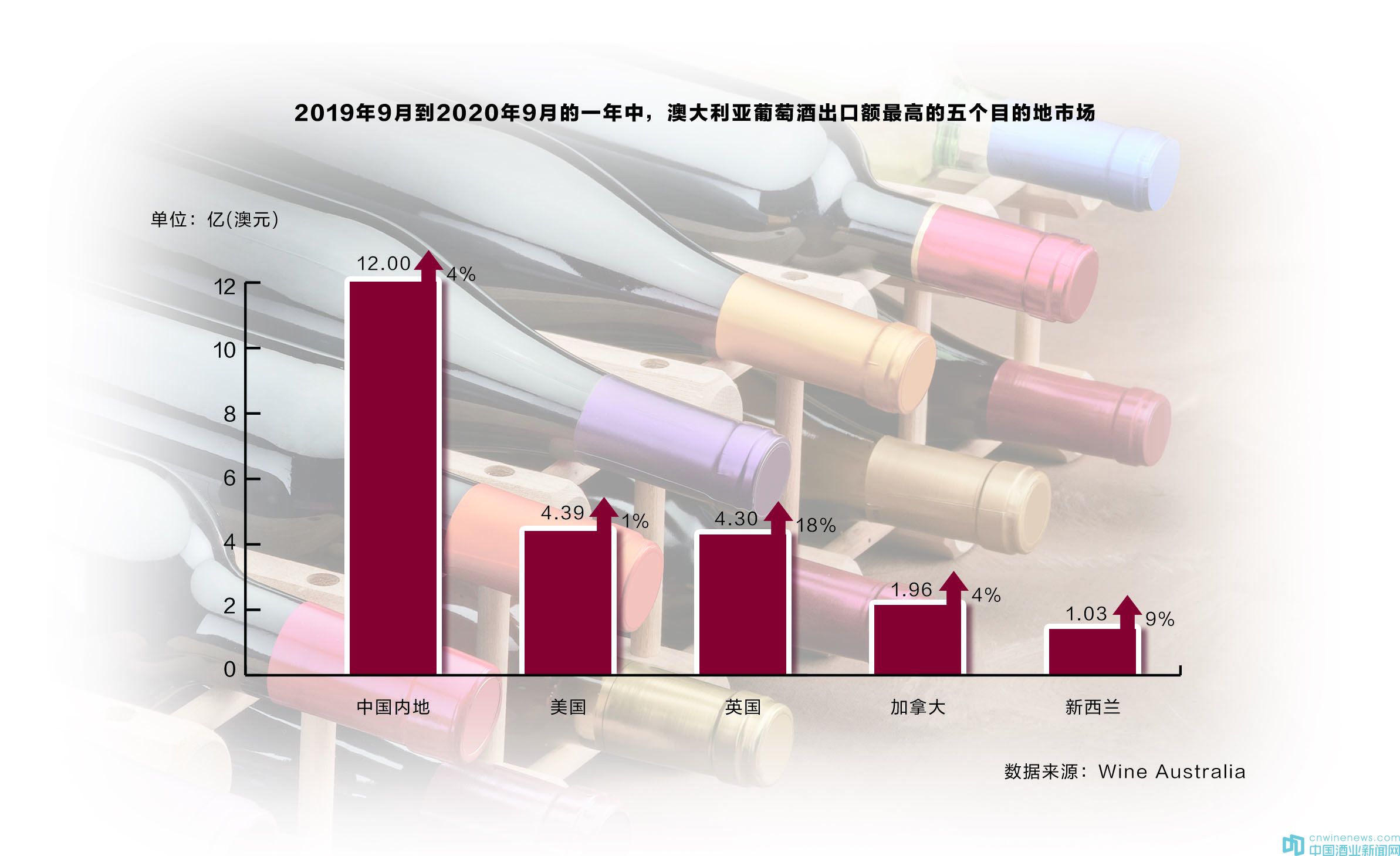 澳大利亞葡萄酒管理局發布的最新出口報告顯示,在截至2020年9月底的一年中,中國仍是澳葡萄酒出口的最大目的地市場,其對中國內地市場的出口額上升4%至11.7億澳元,出口量下滑12%至1.23億升。