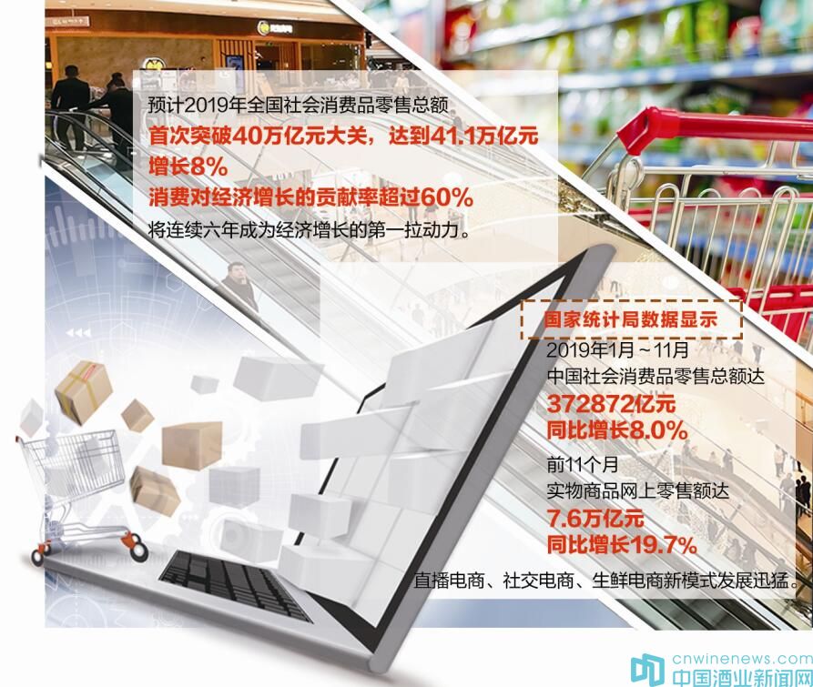 通過數(shù)據(jù)分析,2019年消費(fèi)市場(chǎng)運(yùn)行總體平穩(wěn),平穩(wěn)趨緩,穩(wěn)中有進(jìn)。商務(wù)部市場(chǎng)運(yùn)行司副司長(zhǎng)王斌在2019年12月30日召開的2019年全國(guó)商務(wù)工作會(huì)議媒體吹風(fēng)會(huì)上表示,預(yù)計(jì)2019年全國(guó)社會(huì)消費(fèi)品零售總額將首次突破40萬(wàn)億元大關(guān),達(dá)到41.1萬(wàn)億元,比上年增長(zhǎng)8%,消費(fèi)對(duì)經(jīng)濟(jì)增長(zhǎng)的貢獻(xiàn)率超過60%,將連續(xù)六年成為經(jīng)濟(jì)增長(zhǎng)的第一拉動(dòng)力。2019年我國(guó)消費(fèi)市場(chǎng)運(yùn)行總體平穩(wěn),消費(fèi)規(guī)模不斷擴(kuò)大,結(jié)構(gòu)持續(xù)優(yōu)化,模式不斷創(chuàng)新,消費(fèi)對(duì)經(jīng)濟(jì)增長(zhǎng)的基礎(chǔ)性作用進(jìn)一步鞏固。