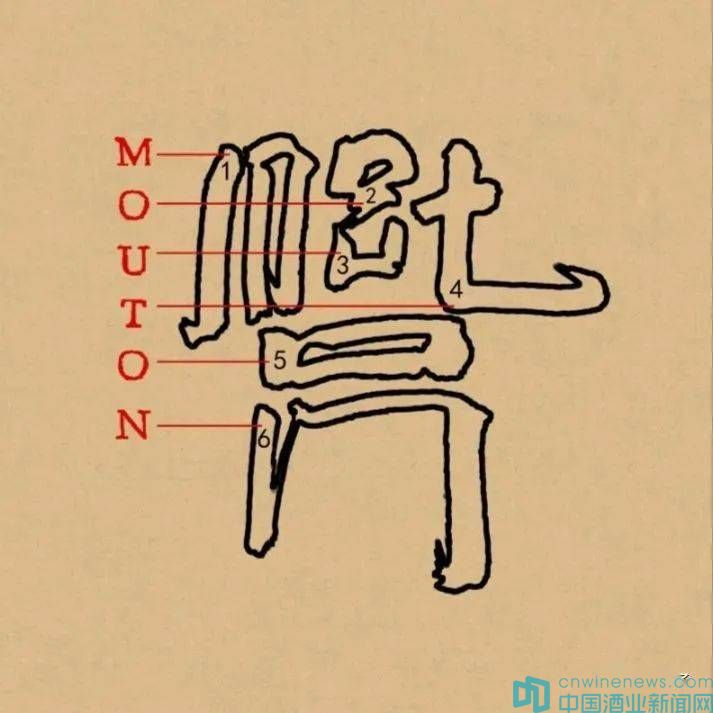 2018年份木桐酒標圖案由徐冰設計的一組“英文方塊字書法”構成,乍看似中國書法,但實際上是由“Mouton”和“Rothschild”兩個單詞的字母創造出來的兩個“漢字”組成。
