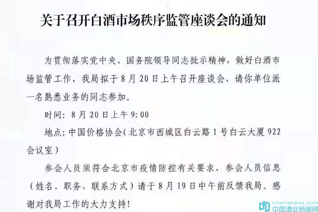 據悉,8月18日,國家市場監督管理總局價監競爭局發布的《關于召開白酒市場秩序監管座談會的通知》。通知顯示,“為貫徹落實黨中央、國務院領導通知批示精神,做好白酒市場監管工作,我局擬于8月20日上午召開座談會,請你單位派一名熟悉業務的同志參加。參會地址為中國價格協會。”