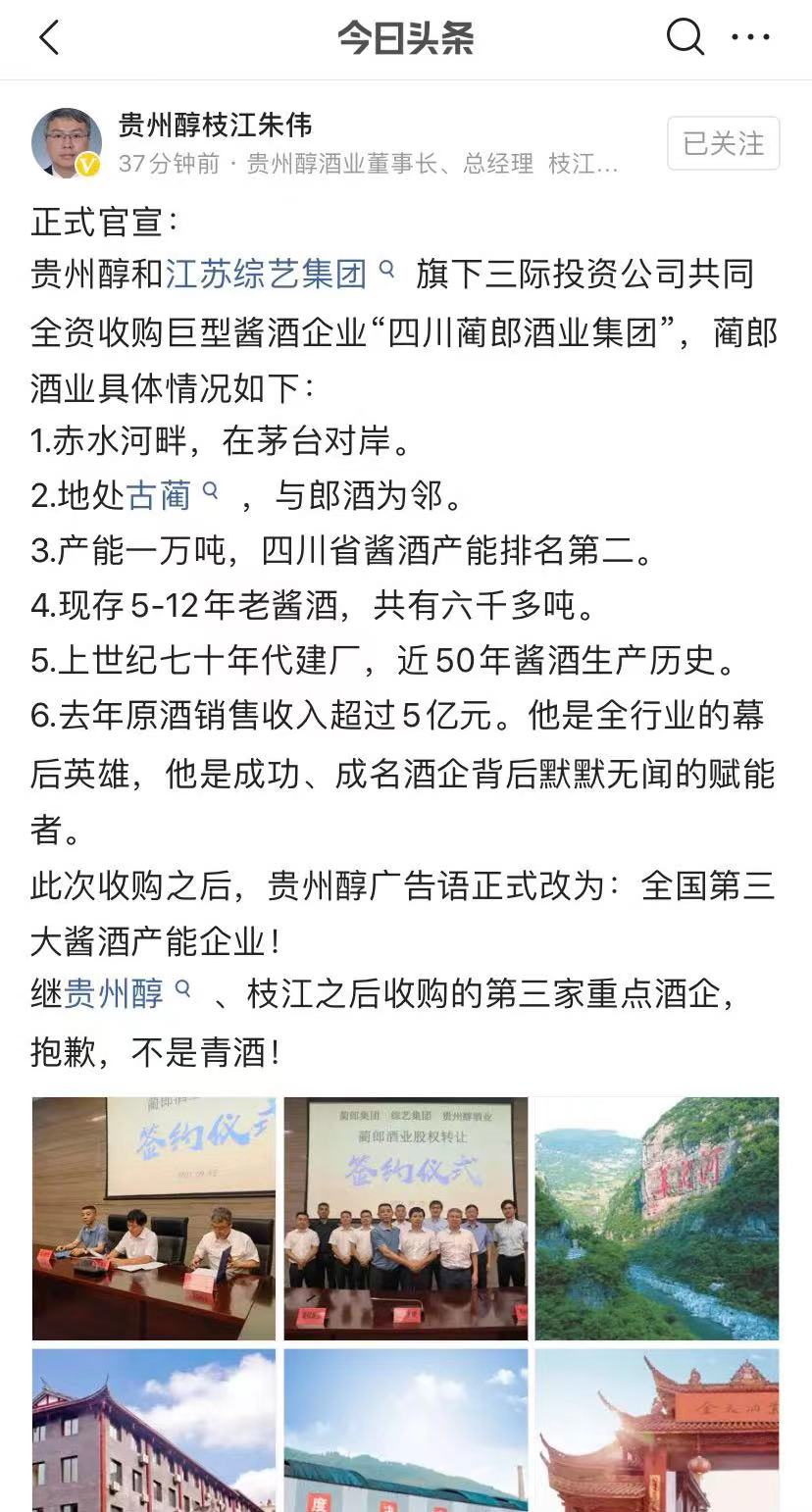 9月15日中午11點57分,貴州醇酒業董事長、總經理,枝江酒業董事長、總經理朱偉在其個人頭條號正式官宣:貴州醇和江蘇綜藝集團旗下三際投資公司共同全資收購巨型醬酒企業“四川藺郎酒業集團”(以下簡稱“藺郎酒業”)。