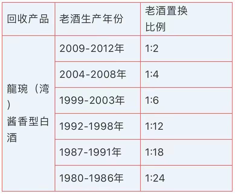 備注:龍琬老酒以53°龍琬狗年生肖酒(醬香)按年份對應比例置換,如“2009年-2012年”“老酒置換比例為“1:2”,即1瓶龍琬老酒置換2瓶龍琬狗年生肖酒。龍琬狗年生肖酒價格為358元/瓶。