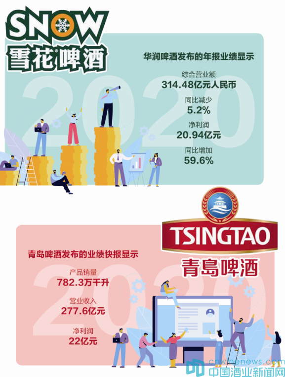 3月22日,華潤啤酒(00291.HK)在港交所發(fā)布2020年度業(yè)績報(bào)告稱,在營收略有下降的同時(shí),實(shí)現(xiàn)了凈利潤的大漲。而截止到3月23日,青島啤酒(600600.SH)發(fā)布的業(yè)績快報(bào)也同樣顯示,在營收略降的同時(shí),實(shí)現(xiàn)了凈利大增。
