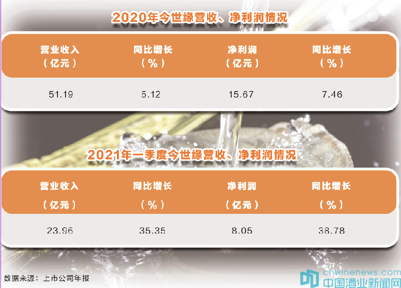 年報(bào)顯示,2020年,今世緣實(shí)現(xiàn)營業(yè)總收入51.19億元,同比增長5.12%;實(shí)現(xiàn)歸屬于上市公司股東的凈利潤15.67億元,同比增長7.46%。今年一季度,今世緣實(shí)現(xiàn)營收23.96億元,同比增長35.35%,凈利潤8.05億元,同比增長38.78%。
