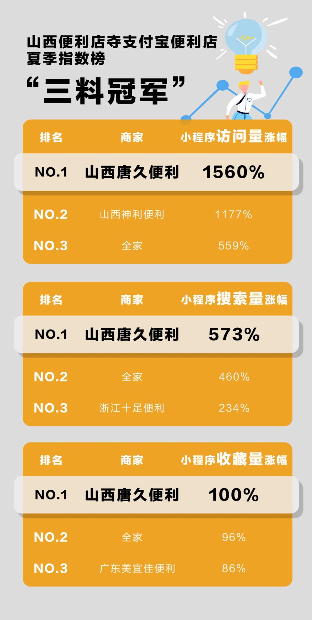 另據8月6日,支付寶開放平臺發布的《便利店行業夏季指數榜》顯示,便利店商家業績近日迎來整體上漲。其中,“地方隊”山西便利店表現尤為搶眼,唐久便利店的小程序一周訪問量增長漲超15倍,成為搜索量、收藏量、訪問量增幅的“三料冠軍”。
