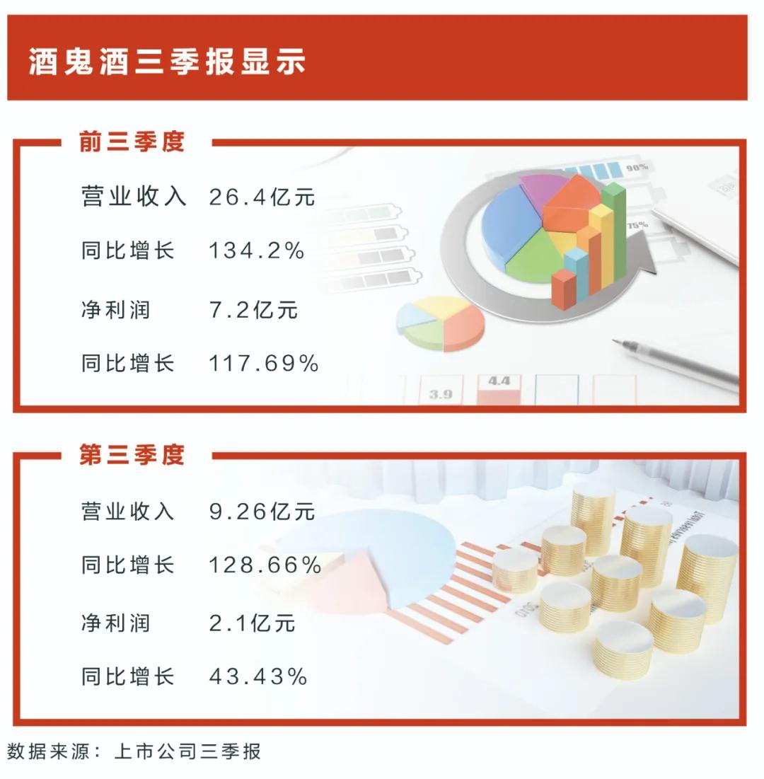 酒鬼酒近日發布的三季報顯示,公司前三季度實現營收26.4億元,同比上漲134.2%;歸屬于上市公司股東的凈利潤為7.2億元,同比增長117.69%。其中,第三季度營業收入9.26億元,同比增長128.66%;歸屬于上市公司股東的凈利潤2.1億元,同比增長43.43%。