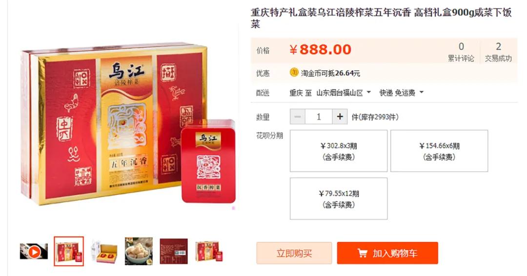 網傳888元的涪陵榨菜禮盒裝,為烏江榨菜推出的五年沉香禮盒裝。據稱在某些平臺其售價達到1500元。但是,《華夏酒報》記者發現,京東旗艦店等網上平臺均已下架這款產品。在蘇寧易購平臺,也不見這款產品的蹤影,零售價達到152元-244元的禮盒裝榨菜產品則依然在列。