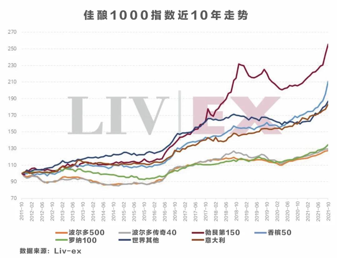 隨著市場(chǎng)的擴(kuò)大和更多酒款的價(jià)格上漲,最廣泛市場(chǎng)衡量的指標(biāo)Liv-ex 1000指數(shù)成為三大指數(shù)中表現(xiàn)最好者也就不足為奇了。