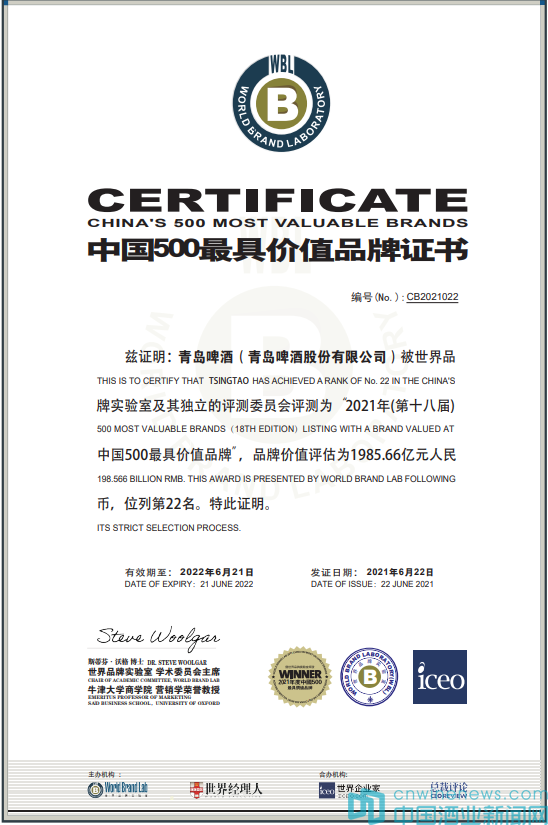 這是世界品牌實(shí)驗(yàn)室(World Brand Lab)連續(xù)十八年發(fā)布《中國(guó)500最具價(jià)值品牌》。自該榜單誕生以來,有著118年歷史的青島啤酒,連續(xù)十八次蟬聯(lián)中國(guó)啤酒行業(yè)品牌價(jià)值桂冠,讓青島啤酒這塊“金字招牌”在時(shí)間的洗禮和檢驗(yàn)中熠熠生輝。