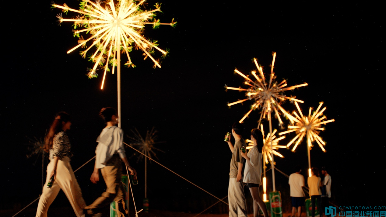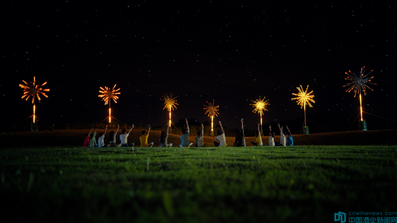 活動(dòng)現(xiàn)場(chǎng),8盞啤酒禮花錯(cuò)落有致地裝置在空曠的草地上。花火下,年輕人坐在露營帳篷前觀看過往賽事,舉杯慶祝,搖旗吶喊。伴隨著青島啤酒一罐罐被拉開的聲音,他們伸出手臂,在空中劃圈,用綻放的手勢(shì)開啟這場(chǎng)浪漫的啤酒禮花秀。一束、兩束,越來越多的禮花從巨型啤酒罐內(nèi)騰空,在夜空依次綻放,足足持續(xù)了60分鐘,打造一場(chǎng)既浪漫又震撼的奧運(yùn)應(yīng)援。