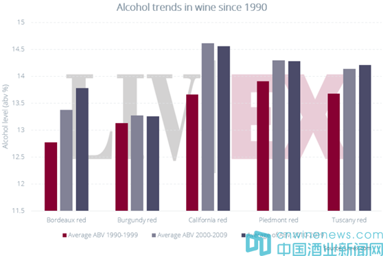 波爾多葡萄酒的酒精含量繼續攀升——盡管是從很低的基數開始。勃艮第是五個地區中唯一幾乎沒有變化的地區。