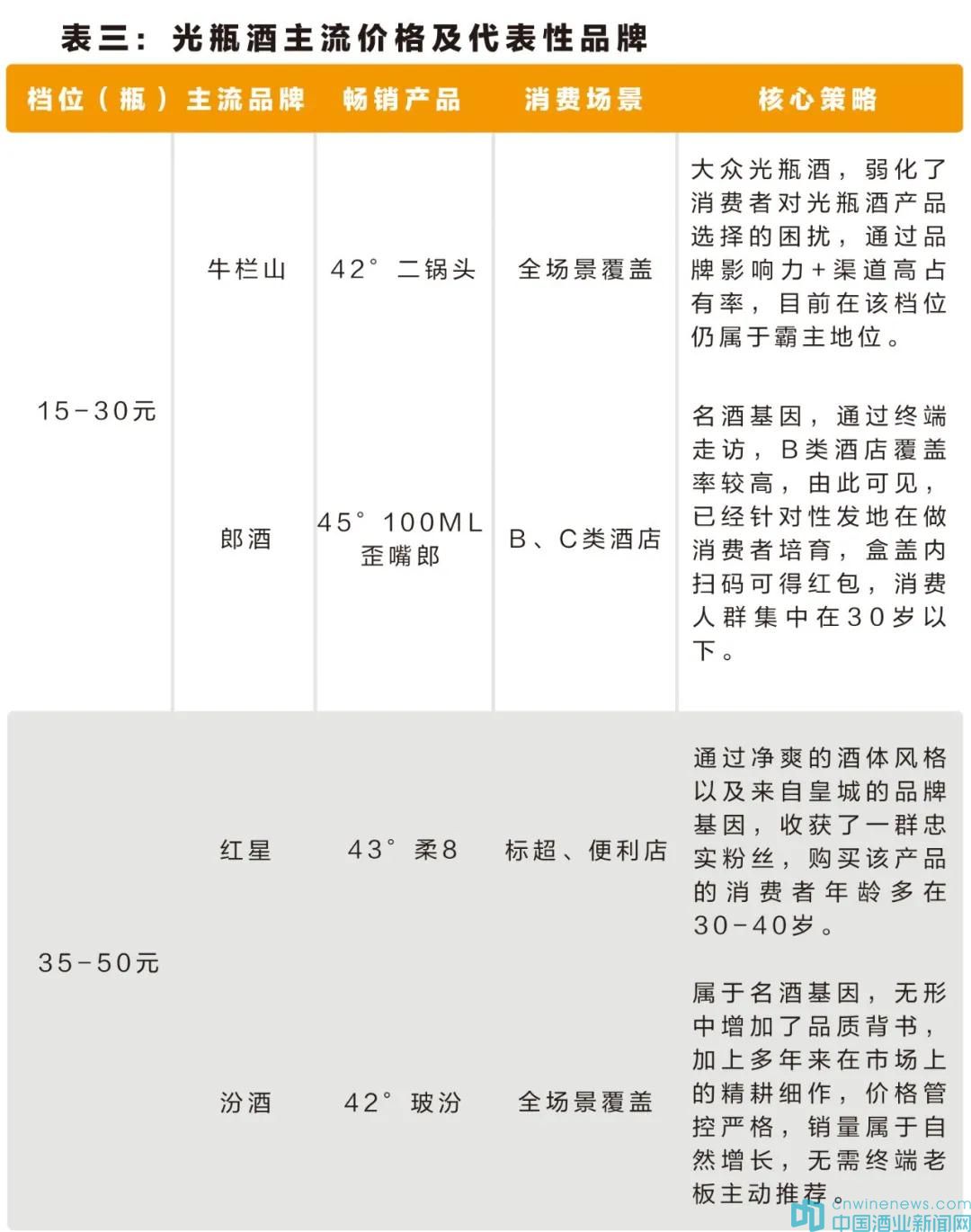 隨著消費趨勢不斷向頭部品牌集中,無論是針對消費者培育還是做渠道布建,頭部品牌做光瓶酒相比于區域性品牌更有優勢,而且在高線光瓶品類中,頭部品牌表現勢頭強勁,未來百元以下盒裝酒的生存空間將逐漸萎縮,甚至會有退市的可能。