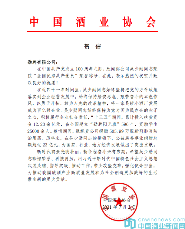 奮斗不止,永葆初心!在中國偉大復興的征程中,在中國酒業高質量發展的永續之路上,還有更多的黨員同志們和基層黨組織,在為實現中華民族偉大復興的中國夢而不懈奮斗。祝愿中國酒業在吳少勛同志榜樣力量的引領和帶動下,深入貫徹落實新時代黨的建設總要求,以奮發有為的精神狀態和求真務實的工作作風,全力抓好企業基層黨建和各項生產工作,帶頭攻堅克難,強化使命擔當,為推動我國釀酒產業高質量發展和為社會創造更加美好的生活做出新的更大貢獻。