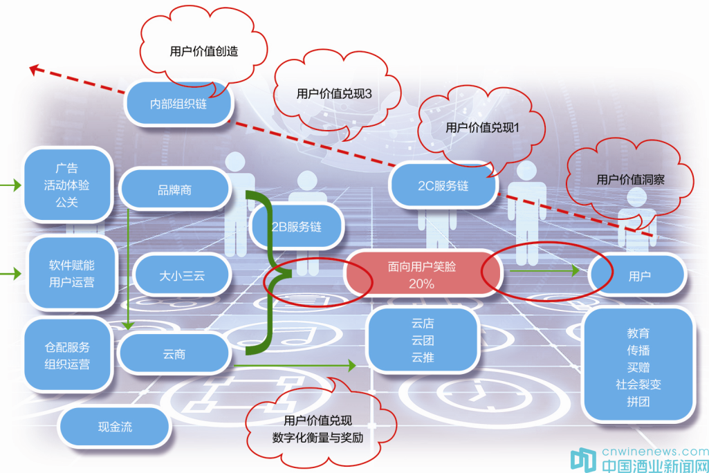 價值創造:傳統鏈條中,價值的創造包括研發、生產、品牌等環節,這些環節是割裂的。而在新鏈條中,企業通過和消費用戶一體化的鏈接,企業內部的研發、生產、品牌環節將更加緊密地依附到消費用戶的需求上,以用戶需求的數據為導向,來反向優化、整合、升級企業內部價值創造的流程環節,大幅提升企業價值創造的效率和銷能。
