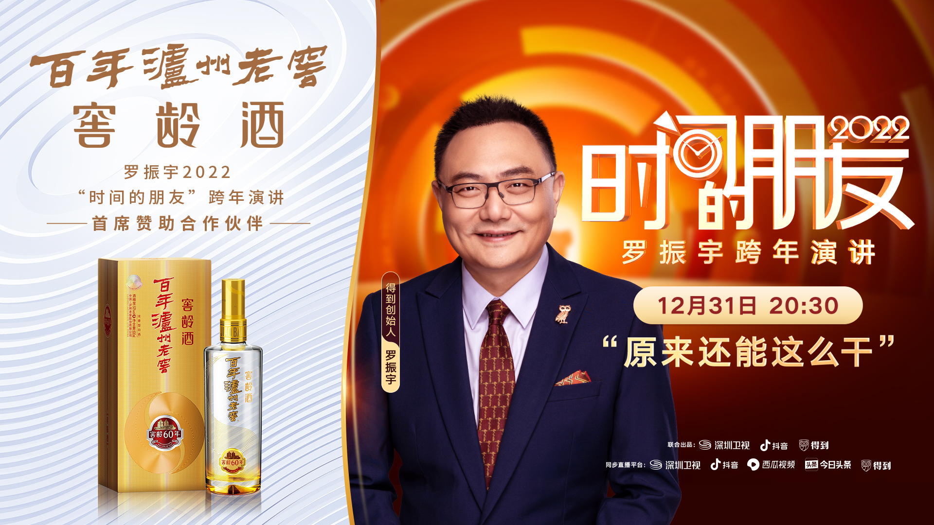 12月31日晚,由深圳衛(wèi)視、抖音、得到App聯(lián)合出品的2022“時(shí)間的朋友”羅振宇跨年演通過(guò)直播與觀眾準(zhǔn)時(shí)見面。作為活動(dòng)的“首席贊助合作伙伴”,百年瀘州老窖窖齡酒攜手羅振宇與萬(wàn)千觀眾“云跨年”,見證彼此前行的每一步。