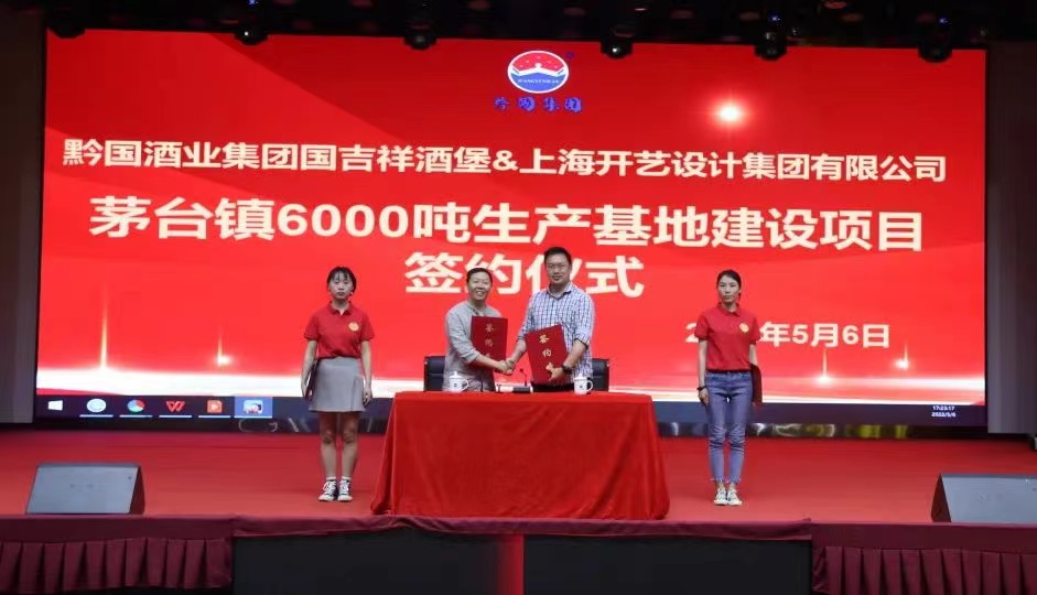 2022年5月6日下午,黔國酒業集團茅臺鎮6000噸大曲醬香基酒生產基地建設項目與上海開藝設計集團合作儀式,在仁懷市壇廠工業園區黔國酒業集團總部舉行。