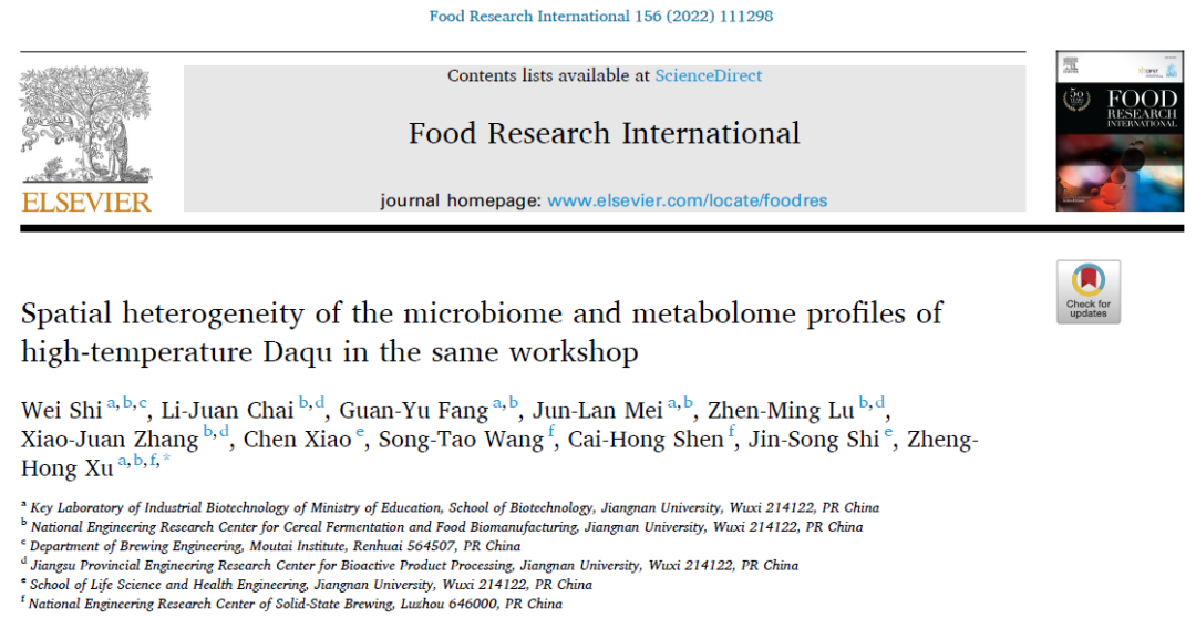 近日,江南大學許正宏教授團隊與國家固態釀造工程技術研究中心沈才洪正高工團隊聯合在國際食品科技專業TOP期刊《Food Research International》(IF:6.475)上發表了題為“Spatial heterogeneity of the microbiome and metabolome profiles of high-temperature Daqu in the same workshop”的研究論文,即“同一車間高溫大曲微生物組和代謝組的空間異質性”。