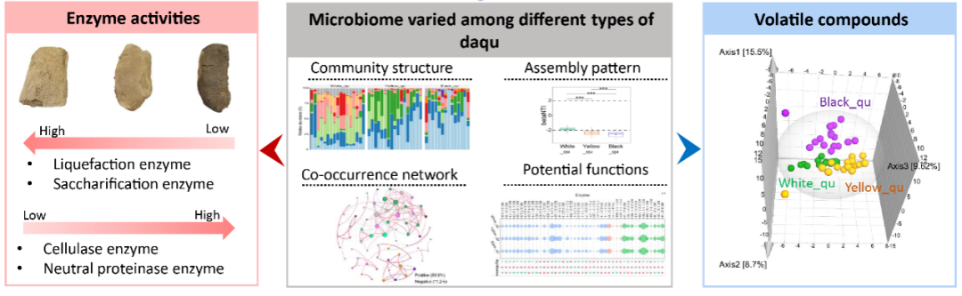 本研究通過非靶代謝組分析、高通量測序等技術,系統分析白曲、黃曲和黑曲的酶學性質、菌群結構及其功能和揮發性物質,并發現發酵溫度是影響大曲微生物群落形成與功能,造成大曲品質差異的關鍵因素。白曲具有較高的液化力和糖化力,黑曲的中性蛋白酶和纖維素酶酶活力較高,而黃曲的多種酶活力適中,是醬酒生產中用量最多的大曲,通常占總量的80%以上。