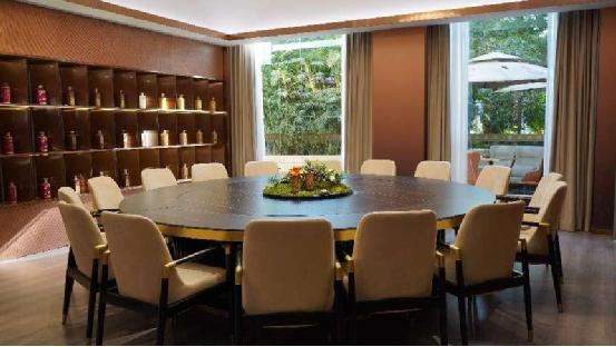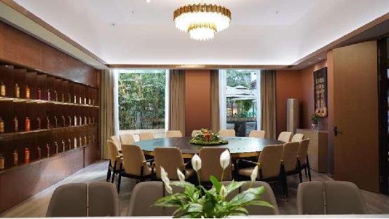 首先是定位明確。據了解,醬酒館的主要定位就是向來賓展示衡昌燒坊的品牌文化,也正因如此,在裝修上體驗館延續了衡昌燒坊深色典雅的風格,突出了品牌的歷史厚重感。同時,環球中心天堂洲際酒店自帶的時尚感,又賦能體驗館形成一種具有奢侈品風格的現代精致感。