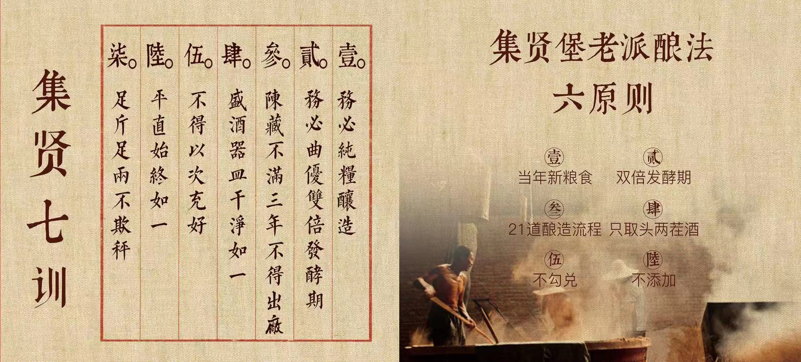 晉善晉美酒業嚴格秉承祖先王協卿提出“振興國酒,質優價廉,決不以劣貨欺世盜名”的宗旨,以優質的新糧食作為原料、經過雙倍發酵期、21道工序、只取頭兩茬酒、不勾兌、不添加的“集賢堡老派釀法六原則”,以及務必純糧釀造、務必經過雙倍發酵、務必陳藏三年、盛酒器皿干凈如一、不得以次充好、品質始終如一、足斤足兩不欺秤的“集賢七訓”得到完整的傳承。