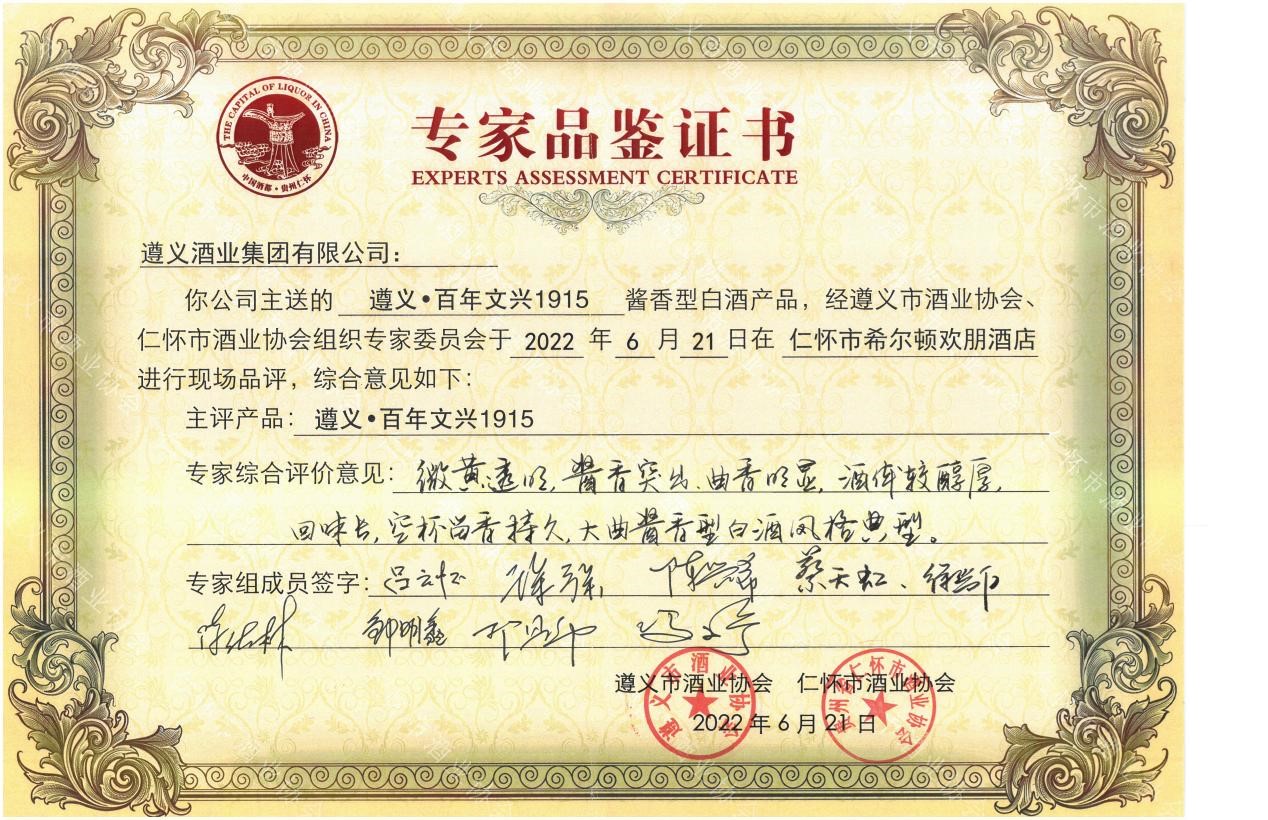 (遵義市<仁懷市>酒業協會為遵義百年文興1915出具品評意見書)