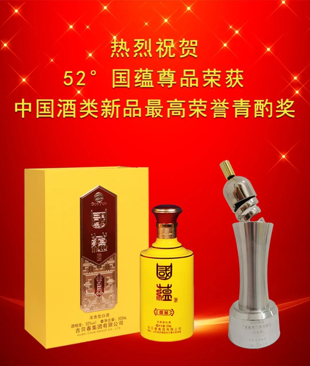 古貝春集團選送的濃香型52度國蘊尊品酒憑借無色透明,多糧復合香氣幽雅,陳香舒適、酒體協調、醇厚豐滿,尾凈味長的風格特點和過硬的產品品質、良好的市場口碑在眾多參選品牌中脫穎而出,榮膺2021年度“青酌獎”酒類新品獎。